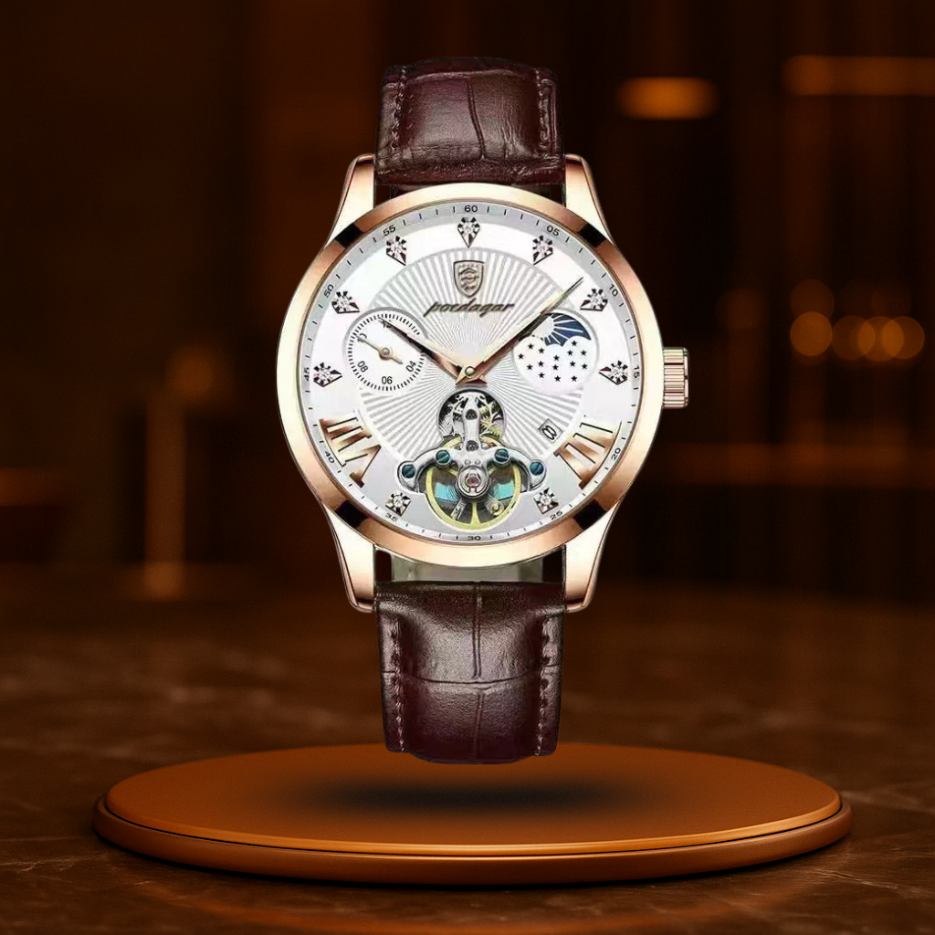 Den vattentäta konstruktionen och den praktiska kalenderfunktionen gör den idealisk för alla tillfällen – oavsett om det är ett affärsmöte, en avslappnad kväll eller ett äventyr i naturen. Den här klockan kombinerar lätthet med elegans för en look som är både självsäker och tidlös.